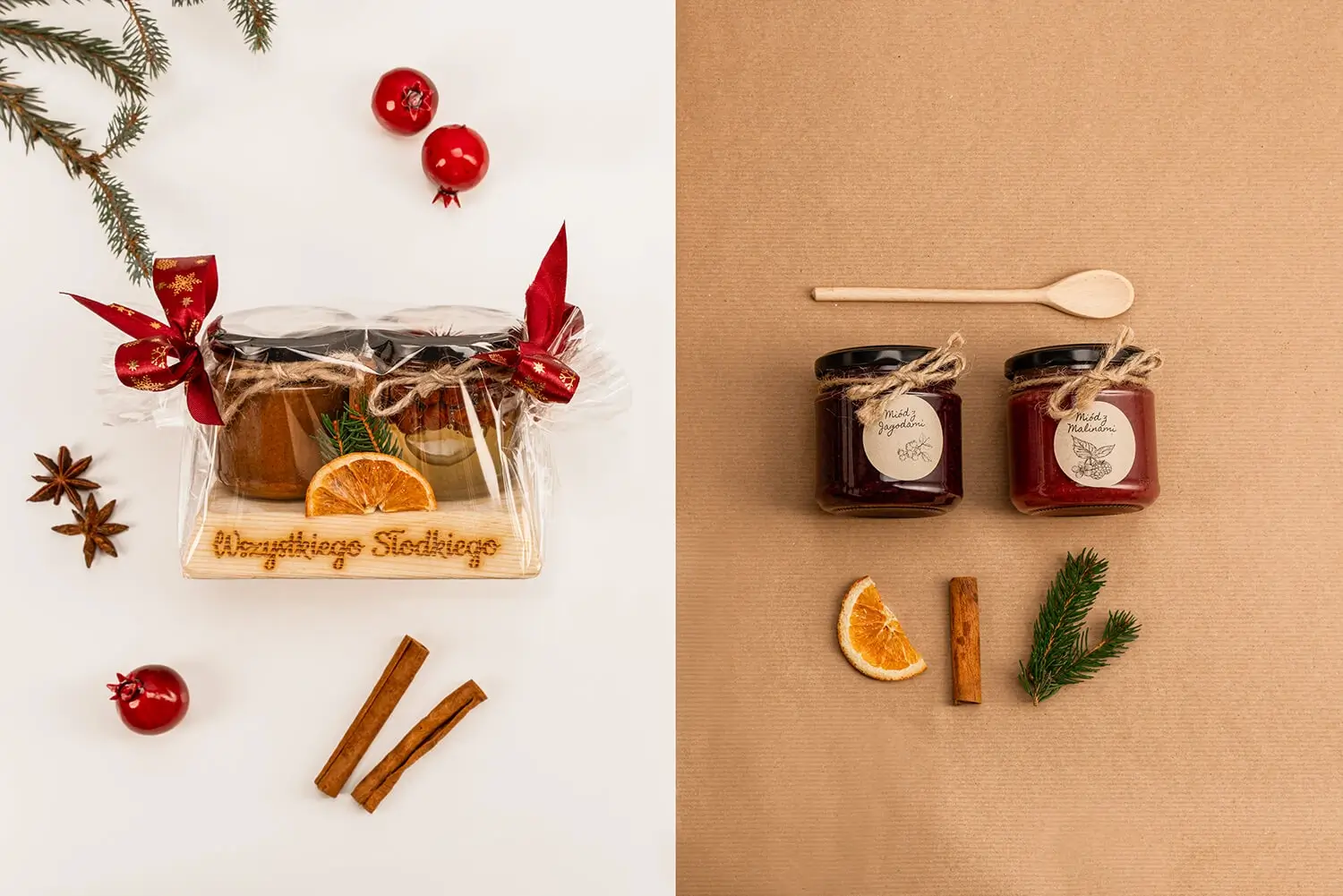 Zestaw dwóch miodów na drewnianej desce z napisem wesołych świąt w skład którego wchodzi: